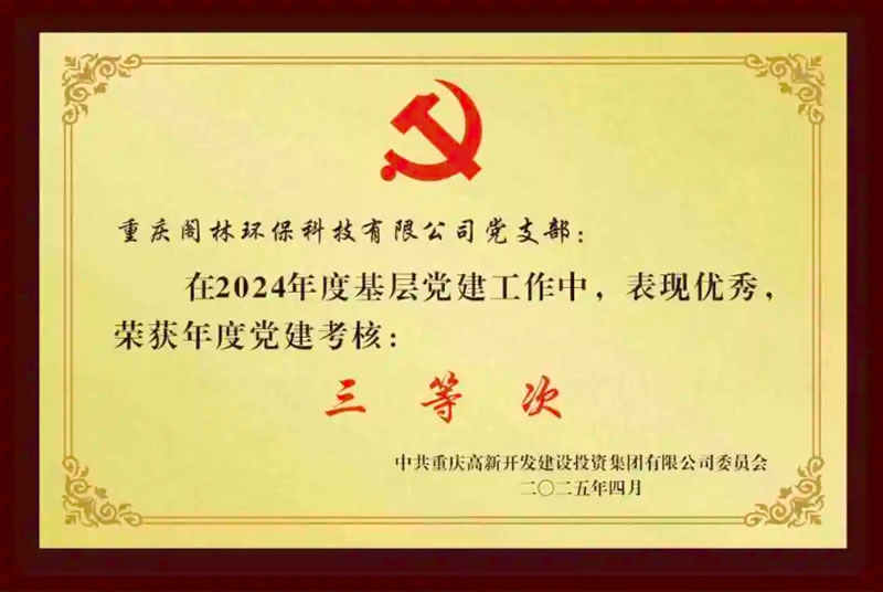 2025年4月29日,重慶高新開發集團黨委召開2025年度非公黨建工作聯席會。會上通報了2024年度非公黨建考核結果,閣林環保黨支部在2024年度基層黨建工作中,表現優秀,榮獲年度黨建考核“三等次”榮譽。